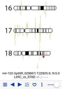 As shown in Figure here, the Liver cancer miRNA expression is compared with Stomach cancer miRNA expression (LIHC_vs_STAD). One can see the high expression of miR-122-5p in liver cancer tissue (T: 22825.9). miR-122 is a well known liver miRNA.